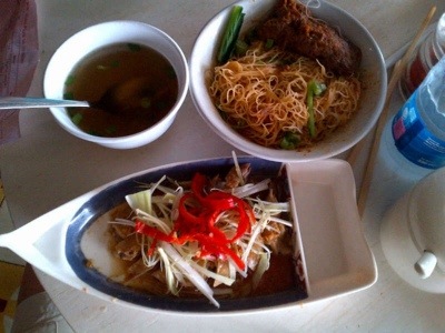 Lontong sayur (a spicy soup of pumpkin, beans, tofu, turmeric, chilli etc)