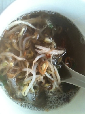 Soto ayam kriuk (a clear chicken soup with bean sprouts, onion and turmeric)