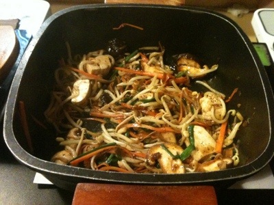 Bihun rendang (rice noodles with veg and a spicy sauce) and a clear soup, with steamed tofu
