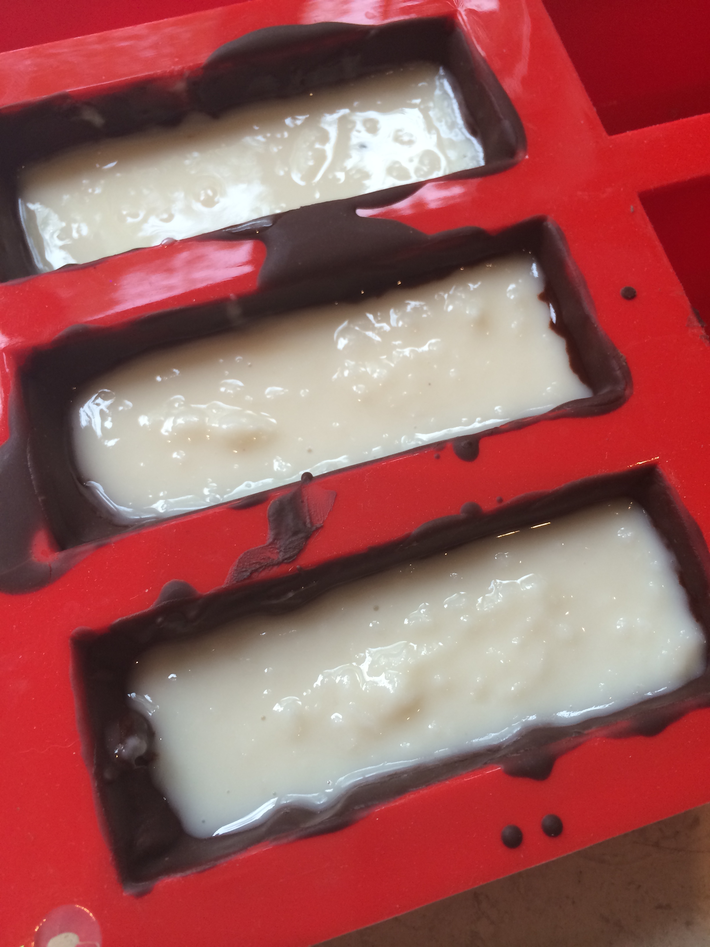 Now prepare the filling. Just melt the coconut butter gently in a warm pan, stirring all the time. Add as much desicated coconut as you want to get the desired texture and then pour in to the chilled moulds. Place back in the fridge immediately until this has set (at least 15 mins)