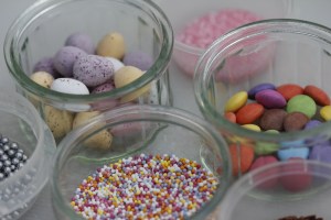 Eggs – made of marzipan, raw choc eggs, choco covered carob beans, shop-bought mini eggs… or just little balls of marzipan