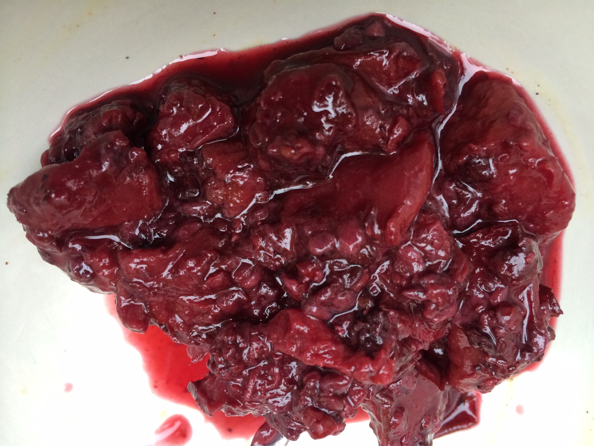To make a quick cherry and apple compote take one punnet of cherries (pitted and roughly chopped in quarters) and approximately 3 – 4 Bramley apples (peeled, cored and chopped) and place in a bowl. Pop in the microwave and cook in short bursts until the apple has softened and the cherries are cooked through (can also be done in a saucepan on the hob). If required add a little unrefined sugar to sweeten (though I prefer it without sugar). Allow to cool.